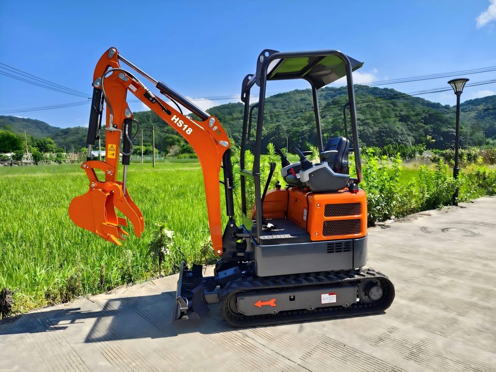 The HS18 Mini Excavator is a zero-tail swing machine with ergonomic pilot controls and has 2 speed piston drive motors to get you from point A to point B on the jobsite.
